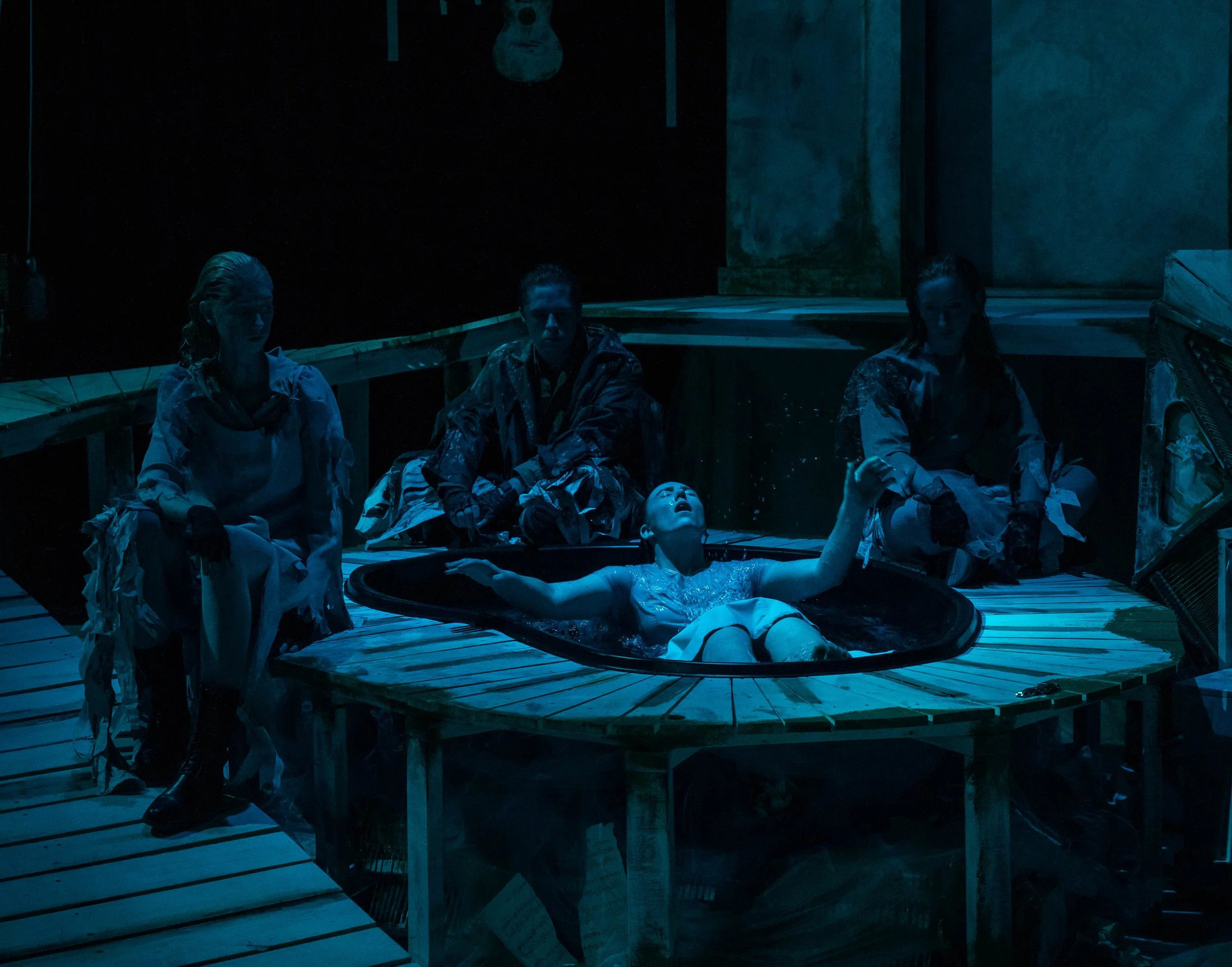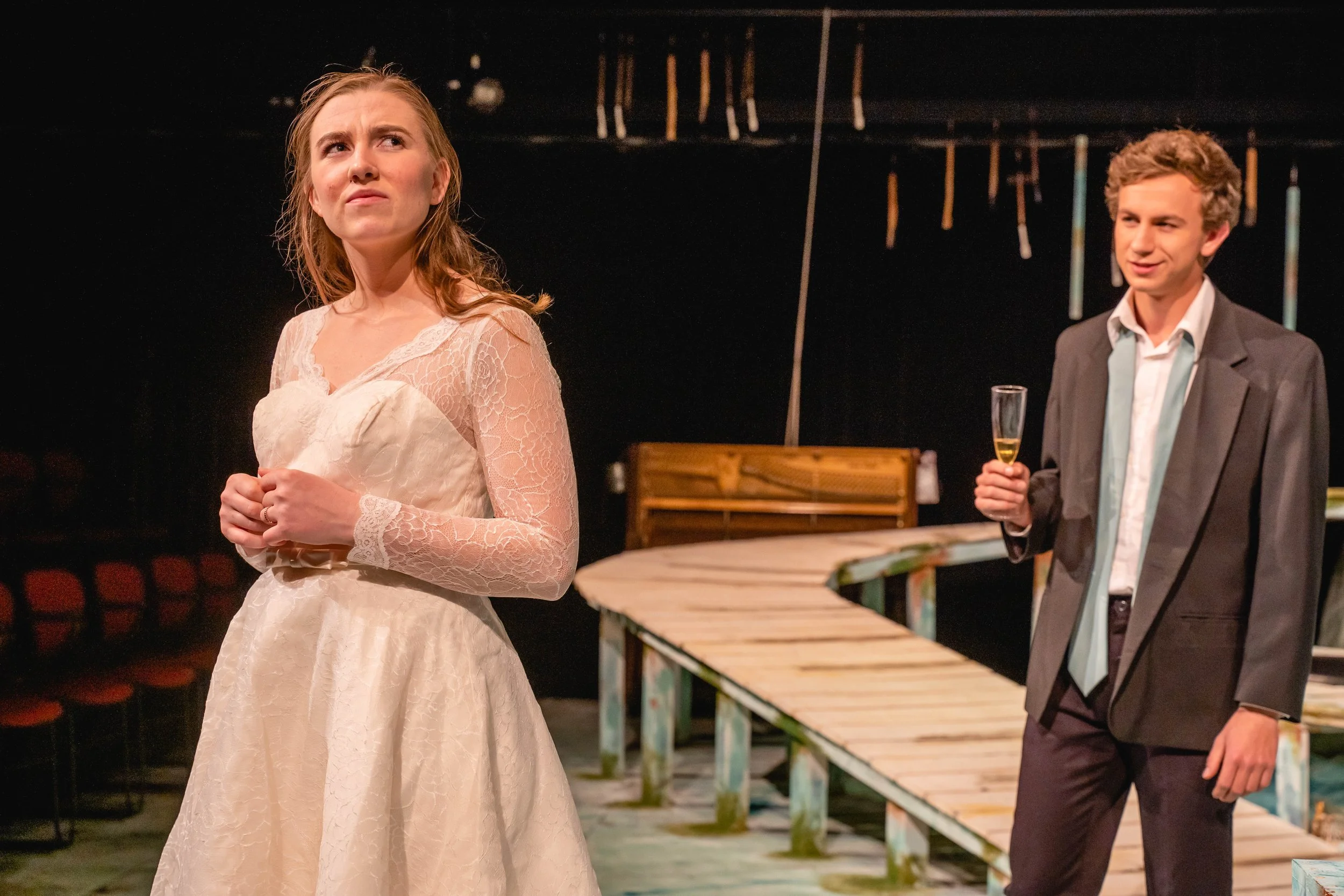 This modern re-telling of the fable of Orpheus and Eurydice privileges her part of the story.  Part of my directing concept for this production was that the Underworld is where music goes to die.  To that end, we incorporated broken instruments into the set - piano keys & sound boards, guitar strings & broken bodies, and torn sheet music.  Strings also served as visual connectors to memories and emotions - attempting, though not always succeeding, to facilitate interpersonal reconnection.